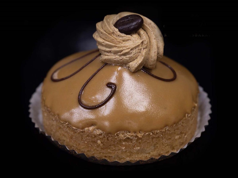 Heerlijk zacht koekdeeg met spijsroom, caramel, kleine bitterkoekjes en mocca creme. En dan dat laatste laagje mocca fondand, om je vingers bij af te likken.